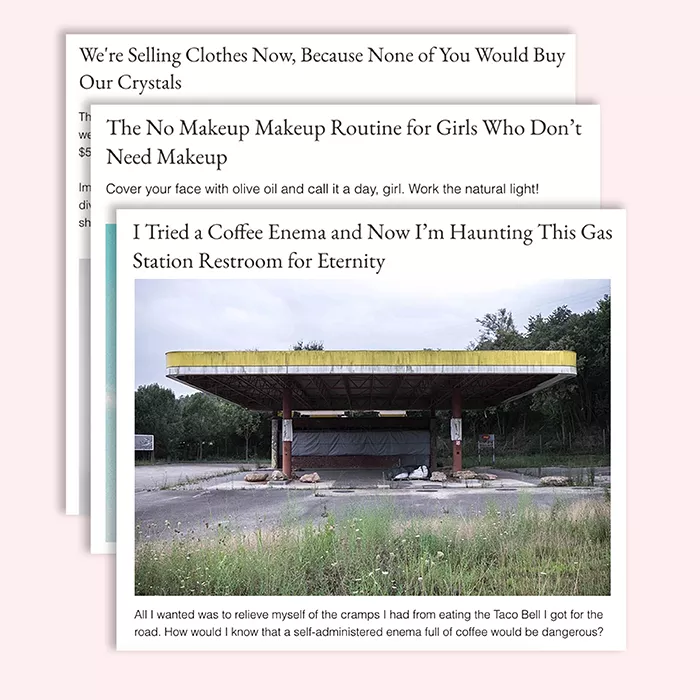 The design of The Glowt has the minimalist glossiness of a site like Goop, with stories broken down into sections like wellness, relationships, fashion, and beauty. Headlines ridicule lifestyle advice (“I Tried Minimalism and Now I Need to Borrow Your Toothbrush”), deranged food trends (“I Tried a Coffee Enema and Now I’m Haunting This Gas Station Restroom for Eternity”), and dubious wellness advice (“How I Learned About Portion Control After Watching This Obese Squirrel At The Park.”)