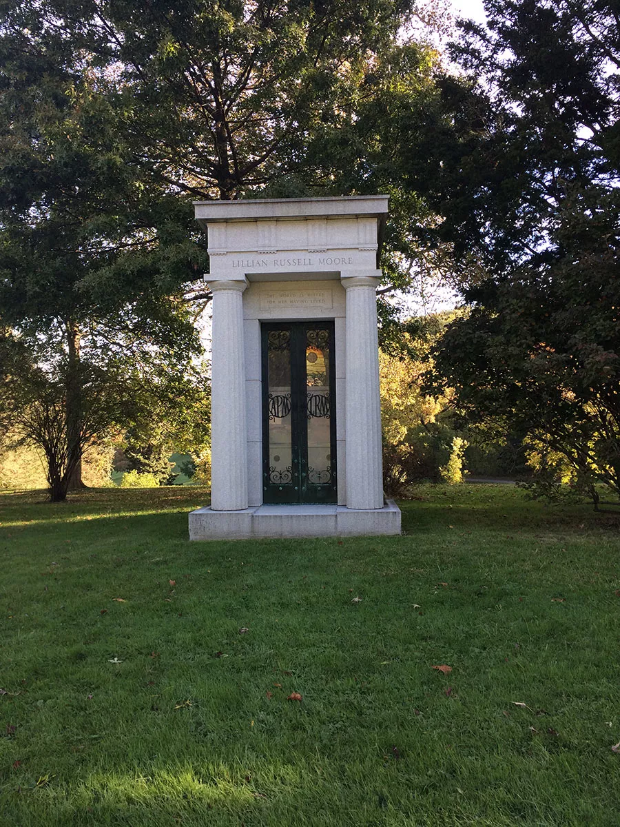 All throughout the cemetery, there are mausoleums, with intricate carvings and stained-glass windows, usually marked by the name of the family’s patriarch. Even in death, people like to flaunt their wealth. Helen Louise Leonard was born in Iowa in 1861, and died in Pittsburgh in 1922. She is buried in a modestly regal mausoleum bearing her full stage name, Lillian Russell Moore. She was an accomplished opera singer and actress, known as “The American Beauty.” She was so well known for her voice that Alexander Graham Bell drafted her to sing over the wire to President Cleveland, as he made first long-distance phone call. She was active in the women’s-suffrage movement and sold Liberty Bonds during the first World War. An engraving on the mausoleum below her name states, “The world is better for her having lived,” and who could argue otherwise?