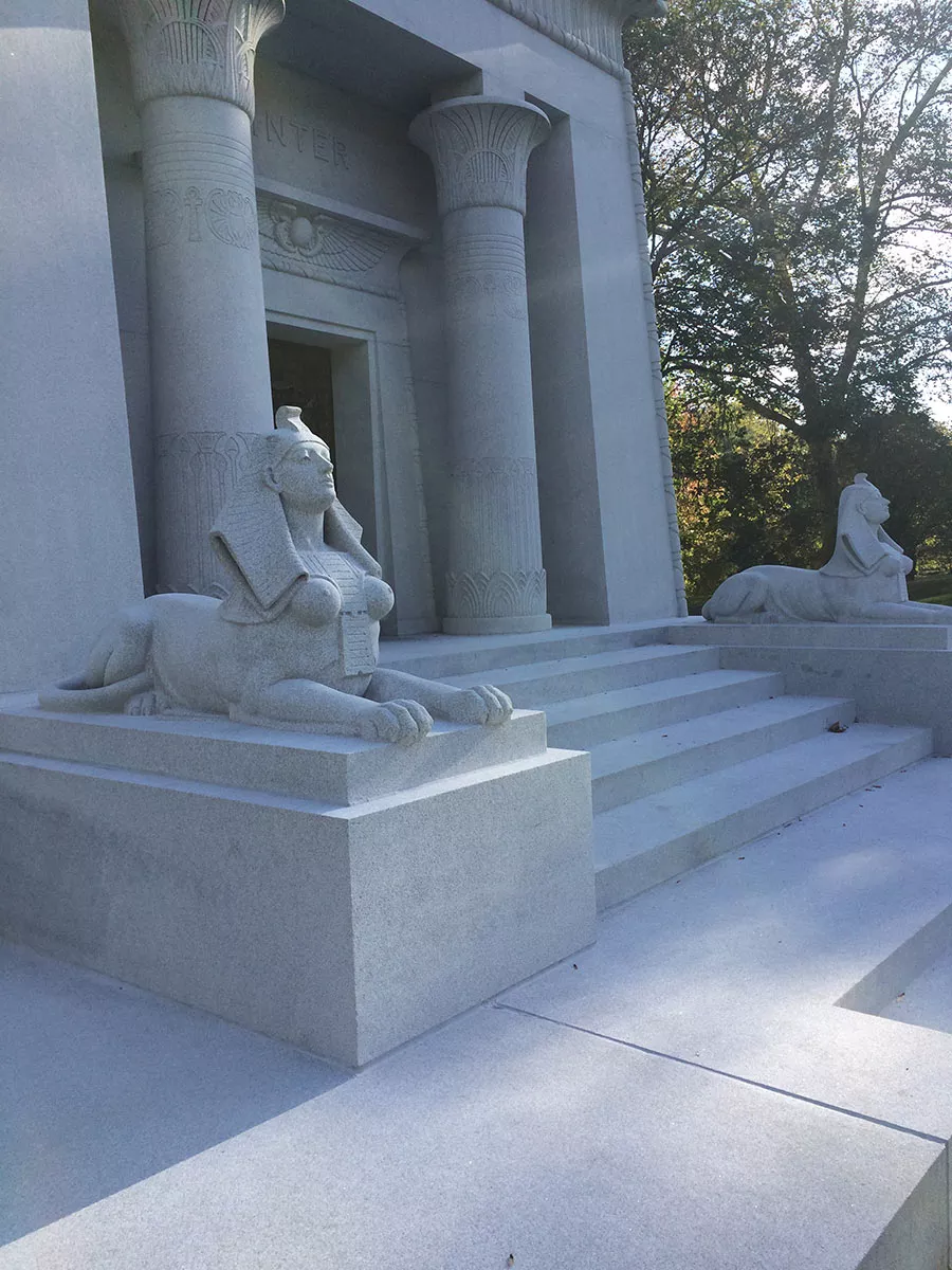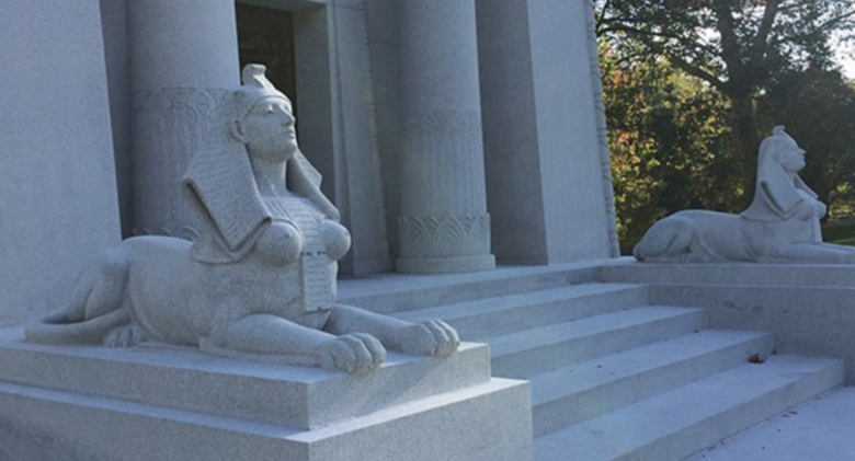 One of the most recognizable structures for frequent cemetery visitors is the massive, Egyptian-style tomb flanked by two regal sphinxes. It was erected upon the death of Emil Winter, one of the founders of the Pittsburgh Steel Company and is almost an exact replica of the grave belonging to department-store mogul F.W Woolworth. Yes, almost. People tend to beat around the bush when talking or writing about this grave, but let’s cut to the chase: These sphinxes have big boobs. We’ve all seen pictures of sphinxes, which are usually depicted as male and boobless. Even the one that have boobs have a sensible size and shape. But none of that for Winter; he’s spending his eternal rest under the guard of two cat/people with huge knockers.