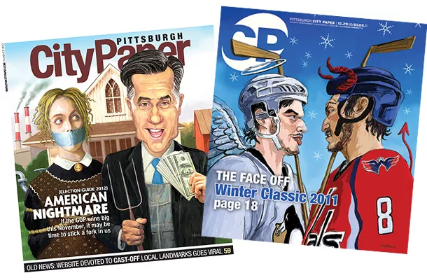 We’re not above making a good idea work twice. It was a great cover illustration in 2012, and with the Pens in the Stanley Cup playoffs right as the Three Rivers Arts Festival comes to town, what better matchup than to combine hockey with art? Editor Charlie Deitch and I played around with several other ideas before deciding on “American Gothic” — Iceburgh as the Mona Lisa, for one. But in the end, Iceburgh and Sidney Crosby posed as “American Gothic” just felt right. We couldn’t be happier that Frank was on board for being the same artist for both.