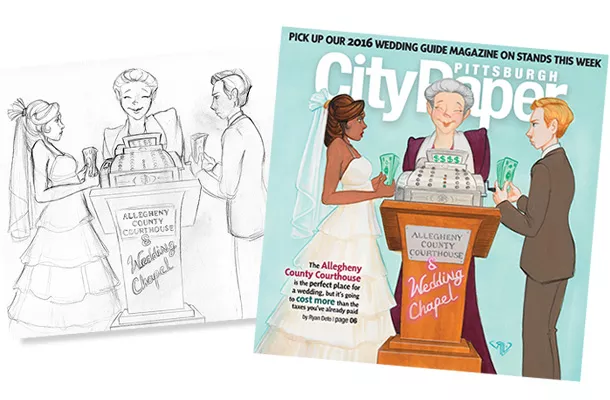 Rhonda Libbey is a local artist from Oakmont who has done work for Pittsburgh City Paper for more than 10 years. Rhonda’s cover illustration this week depicts a cute wedding scene, but she’s best known for her work in the world of science fiction and fantasy. Scroll through her online gallery and you’ll see monsters, dragons, skeletons and a great selection of winged creatures.
