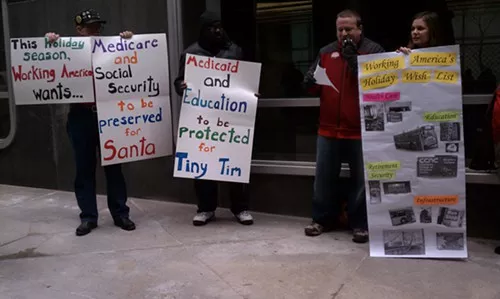 The group of about a dozen protesters presented a Casey aide with petitions and a holiday wish list which asked for health care, retirement security, infrastructure and education.