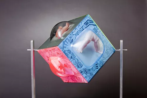 Gruber “was always thinking of new and innovative ways” to work, says Mance. “Mixologists” was especially interesting: Gruber supplied Mance with a plastic sculpture she’d made in the 1980s and told her to modify it. “She let me take it apart and add some drawing pieces inside.” To help, Gruber also sent Mance a list of words “that would inspire me.” (The “Mixologists” photo at right is courtesy of Gruber’s assistant, Dan Mohan.)