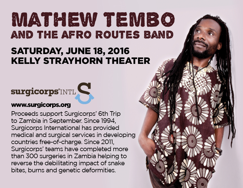 The Kelly-Strayhorn Theater hosts a concert by Zambian-born musician Mathew Tembo and the Afro Routes Band to benefit Surgicorps, which provides free medical care in developing countries.