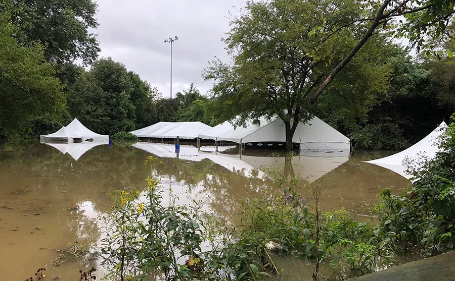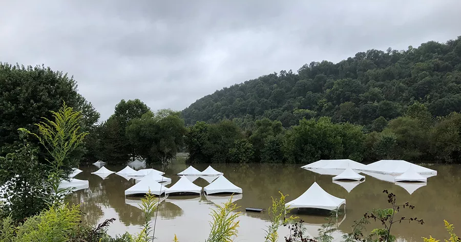 “Thankfully, the RiverPlex doesn’t flash flood,” says Mairin Petrone, executive director of Pittsburgh Irish Festival. “We had some warning and my team jumped into action.” Everything valuable was removed from the site, but tents are still up, their pointed tops visible poking out of the high water.