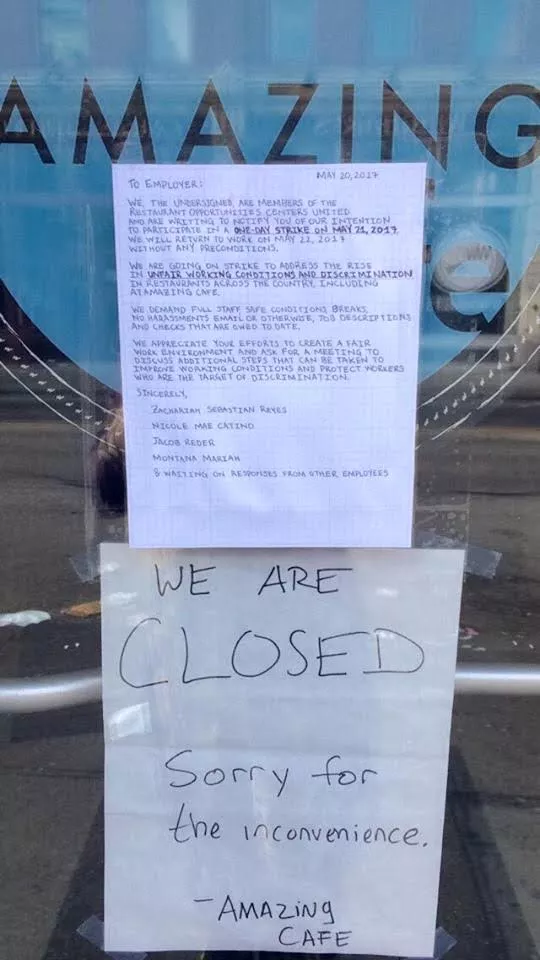 Amazing Cafe workers reached out to Romanus sometime last week, and he advised them on how to legally practice their right to strike. None of the cafe workers at Amazing are unionized, but the National Labor Relations Board Act allows organized and unorganized workers to strike as long as they give notice to their employers and announce when they plan to return to work.