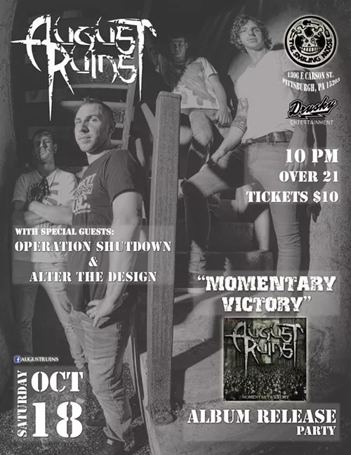 Pittsburgh punk-rock group August Ruins is hosting an album release party Sat., Oct. 18, at The Smiling Moose. Since forming in 2009, the band has gone through a number of lineup and name changes before releasing two independent EPs. Its debut album, Momentary Victory, released September 2014, was produced and recorded in Cleveland in only 10 days. The group produces California pop-punk mixed with metal and hard rock that the Pittsburgh scene classifies as “punkcore.” August Ruins is excited to present fans with a polished full-length to add to their collection. You can see them perform live with special guests Operation Shutdown and Alter The Design.