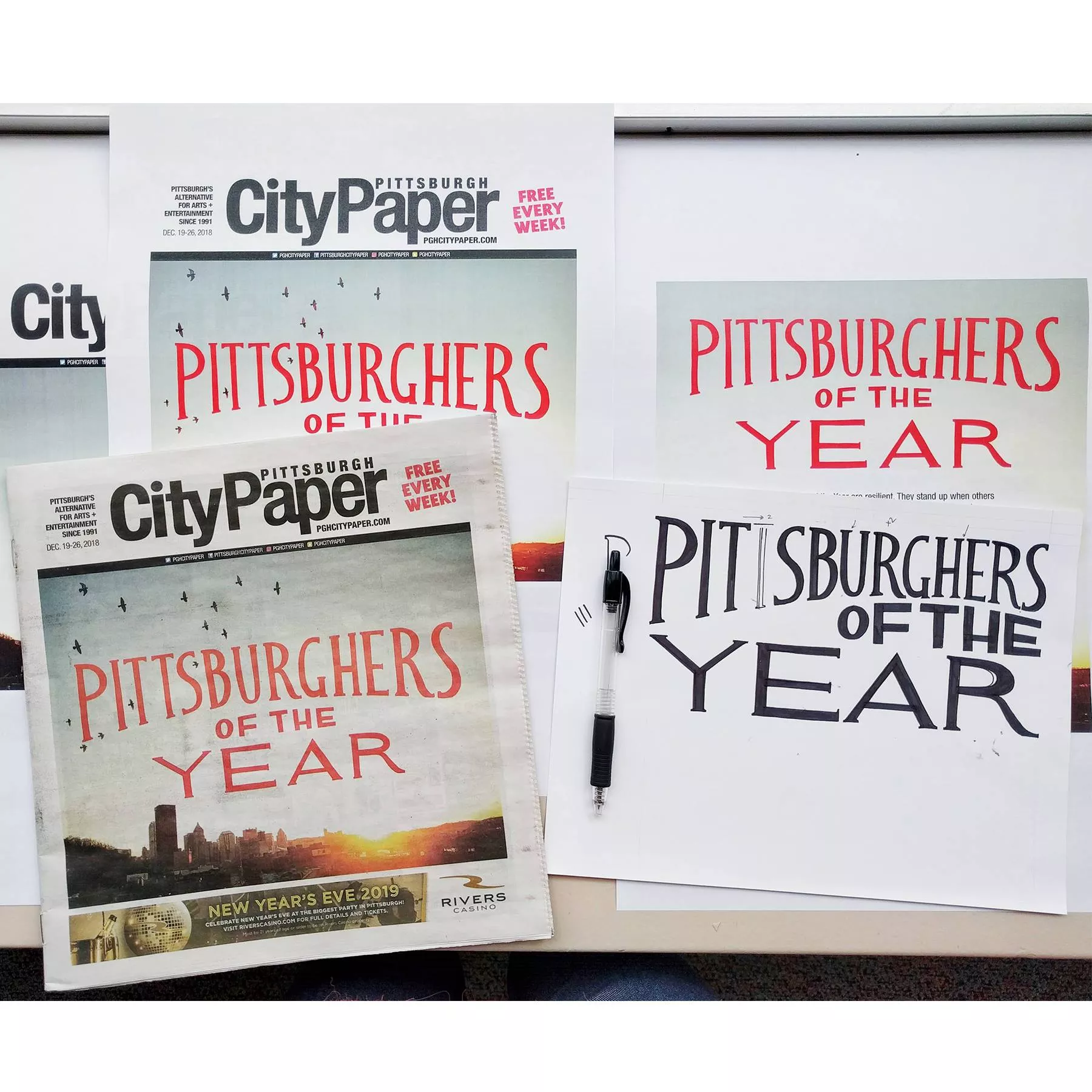 But it was as Art Director for the past 13 years where I really fell in love with Pittsburgh, as I worked behind-the-scenes with so many amazing artists and photographers who taught me to look at the city through their eyes. After designing almost every cover and editorial story in the paper myself for all these years, it brought me great joy to finally hire an Editorial Designer a few weeks ago to help me with the paper’s design. Abbie Adams, not just a great designer but a fantastic illustrator too, created this cover image her first week, hand-lettering the Pittsburghers of the Year title and designing it on top of a beautiful cover photograph Jared took of the city skyline.