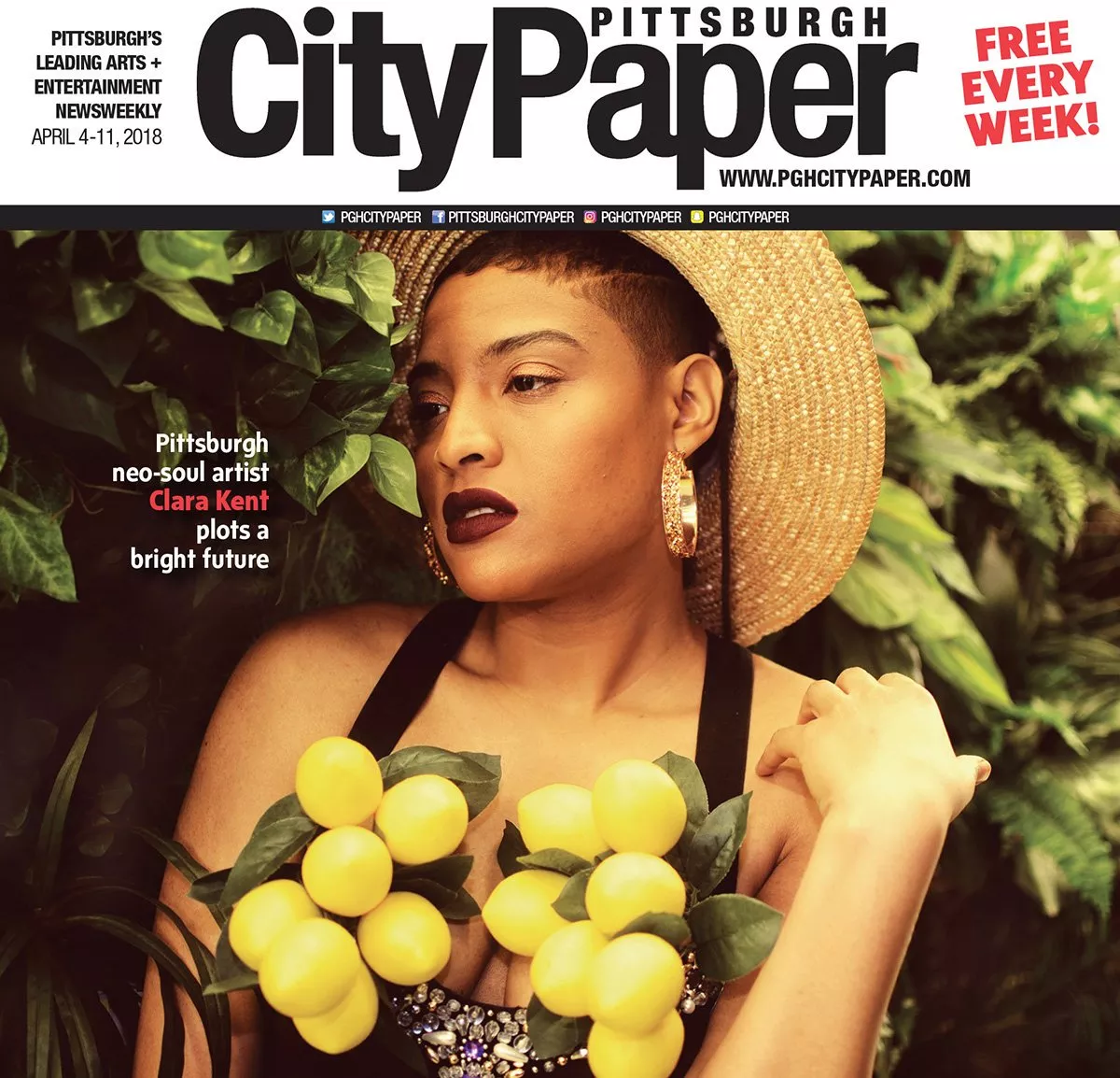 That beautiful cover photograph of Pittsburgh singer Clara Kent looks like it was taken in a gorgeous garden, right? Prepare to have your mind blown. Photographer Huny Young took the “Michaels’ Challenge” for this cover photoshoot, putting Clara in a bustier and posing her in front of plastic greenery and lemon branches in the floral aisle at Michaels arts and craft store at North Hills Village. Every photograph Huny turned in was killer and each could have easily been Clara’s next album cover. The best part of giving Huny this assignment? Finding out she and Clara became good friends after meeting for this shoot. They even continued to work together on more projects. Here’s a behind-the-scenes shot from Clara’s Instagram account where you can see more of the backdrop.