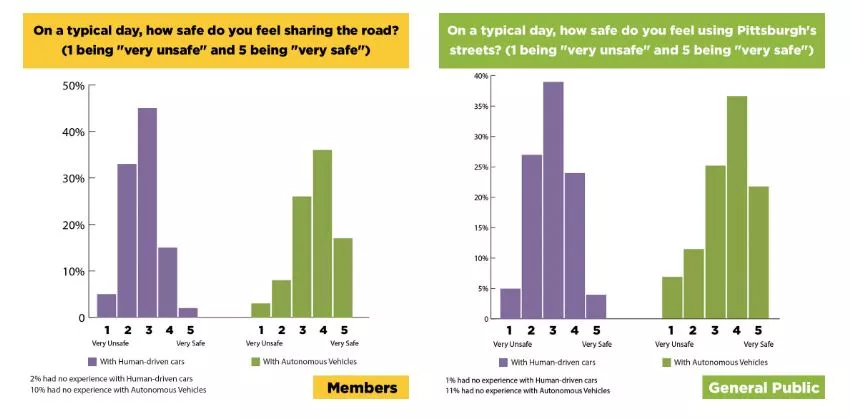 The survey compiled responses from 321 Bike Pittsburgh members and about 800 non-members. About 40 percent of members said they have interacted with a driverless car either on bike or on foot (non-members have interacted with AVs slightly less on bike, but slightly more on foot).