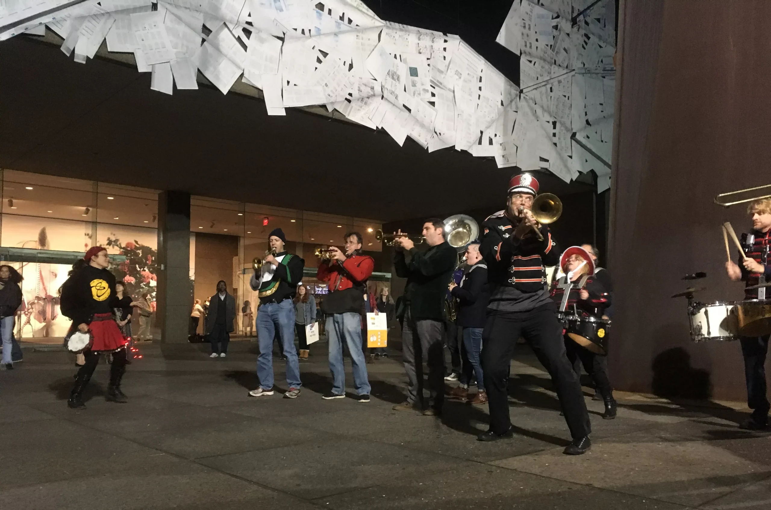 Things got loud outside of the Carnegie Museum of Art on Thursday night when Busnegie hosted a public party in the square. Giant puppets by Cheryl Capezzuti swayed as Colonel Eagleburger’s Highstepping Goodtime Band energetically blasted pop hits such as “SexyBack.” Some onlookers, many of them dressed up for the special Third Thursday Carnegie International event going on inside, jumped in to dance.