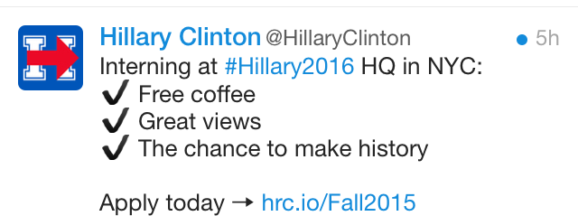 Hillary wants you to work for free coffee. (I volunteered for Carter 1980, where we were given free [and possibly contaminated] ice cream, which got me a free hepatitis shot, so don’t underestimate the potential perks.)