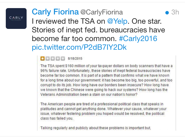 Carly Fiorina reviews the TSA on Yelp, and somehow the TSA is to blame, not just for taking our shampoo (curiously not mentioned), but for problems with Chinese hackers and the VA.