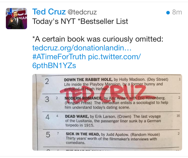 Speaking of reading, Ted Cruz spent the week griping about the (mis)representations of his book’s sales numbers. Putting the vanity in vanity publishing …