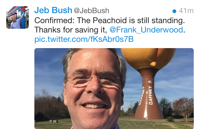 And Jeb takes another awkward photo, this time posing with a giant ass-on-a-stick.