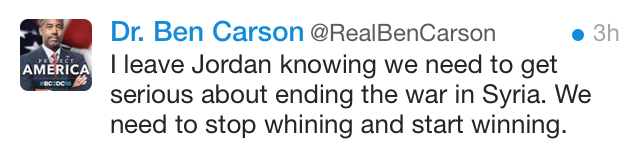 Dr. Ben Carson spent the holiday overseas getting his foreign policy on, and he returned with this locker-room guideline on Syria.