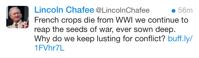 Chafee also having trouble with metaphors this week, though points for lyricism and commenting on events of 100 years ago.