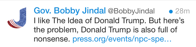 And Bobby Jindal tried kicking some dirt on Trump in a series of tweets, including this awesome Zen-ish insult. Discuss how the Idea of Donald Trump differs from Donald Trump.