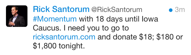 Santorum got his numerology on (at this stage, it can’t hurt), but left out: $.18 and $1.80. Also, $18,000,000, if you hit the Powerball this week and are feeling frisky about a low-polling candidate.