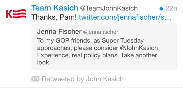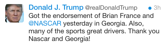 This week in meaningless endorsements: Trump got the rich guy who owns NASCAR and John Kasich got “Pam, from The Office,” who is not a real person.
