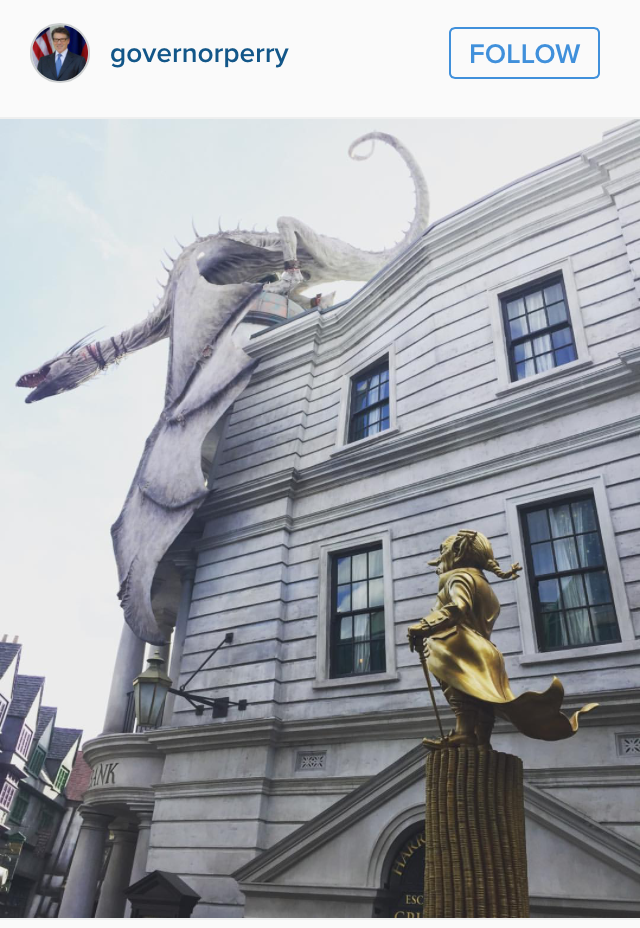 Lastly, I gotta give it up to former candidate and former Texas Gov. Rick Perry, who pretty much said, “Eff this primary shit,” and took off for Hogsmeade at The Wizarding World of Harry Potter. Things gotta be less crazy at the Goblin Bank.