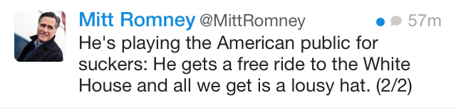 Mitt Romney strikes me as the kind of guy who would never wear a garishly branded ball cap in the first place, but: point taken.