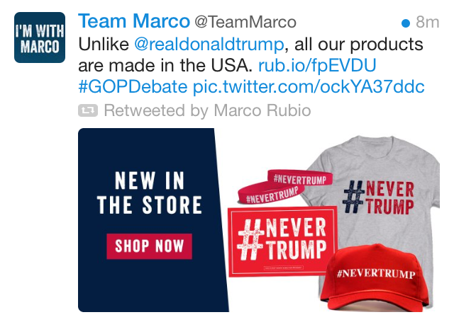 Marco Rubio tweeted out this new merchandise during the debate, but minutes later, vowed to support Trump if Trump was the eventual Republican nominee. “Never” is the new “whatever.”