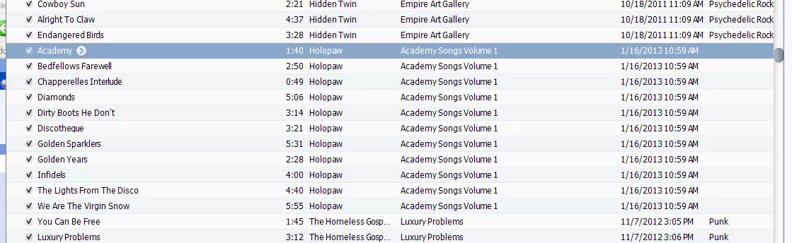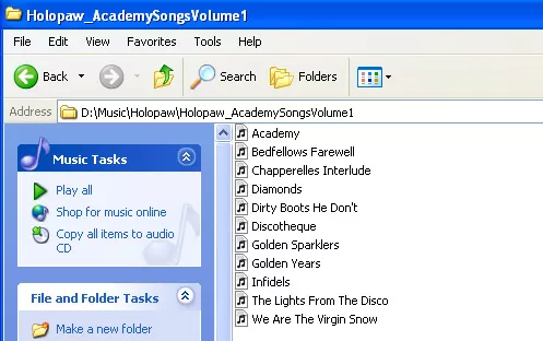 In order to get an album to play in the correct order, one has to either name the files so that it will (“01 Academy,” “02 Golden Sparkler,” etc.) or tag the track numbers, which … wasn’t done here: