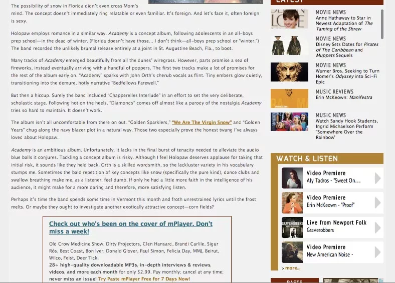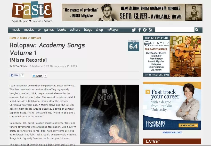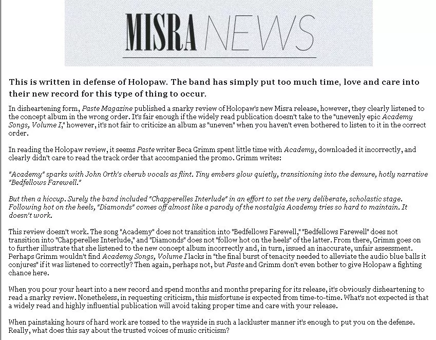 The most interesting email to come across my desk this morning was from Misra Records, who took issue with a review that Paste Magazine ran on the new album from Misra’s Holopaw. The text of the email is here on Misra’s website.* You can also read the original version of the review — which Paste has since appended — below that press release.