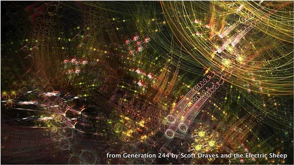 Electric Sheep is actually a collaboration between Draves’ software and, at latest count, some 450,000 computers and their users. The images are rendered as screen-savers that participants vote on. The images that are most popular “mate with each other and reproduce,” as Draves has put it.