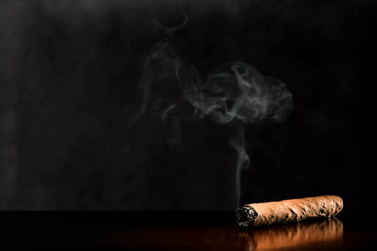 5. A framed illustration of a cigar smoking a cigarette.