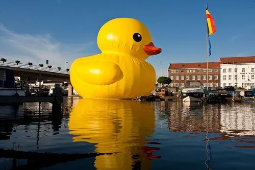 The duck in question is The Rubber Duck, an international phenomenon involving a yellow ducky the size of a yacht that’s already turned heads from Amsterdam to Sao Paulo and Hong Kong. Here’s a photo from the artist’s site:
