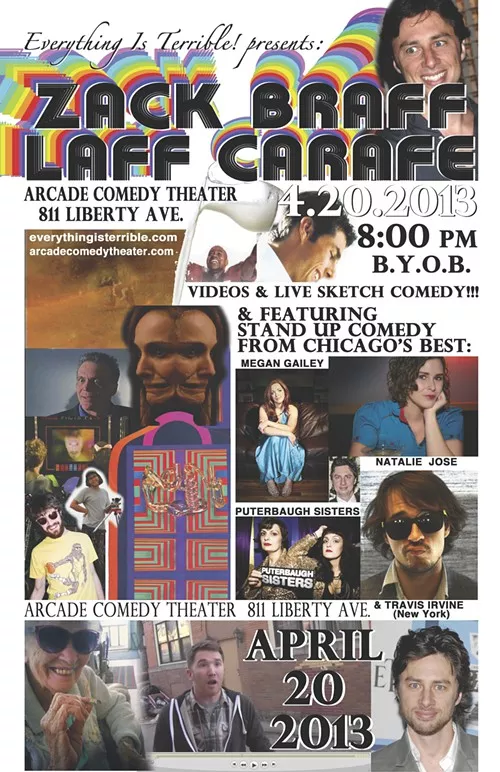 This Saturday at Downtown’s new Arcade Comedy Theater, the group brings its pop-culture inspired comedy show to Pittsburgh with the ironically titled Zack Braff Laff Carafe. (Mr. Braff will not be present.)