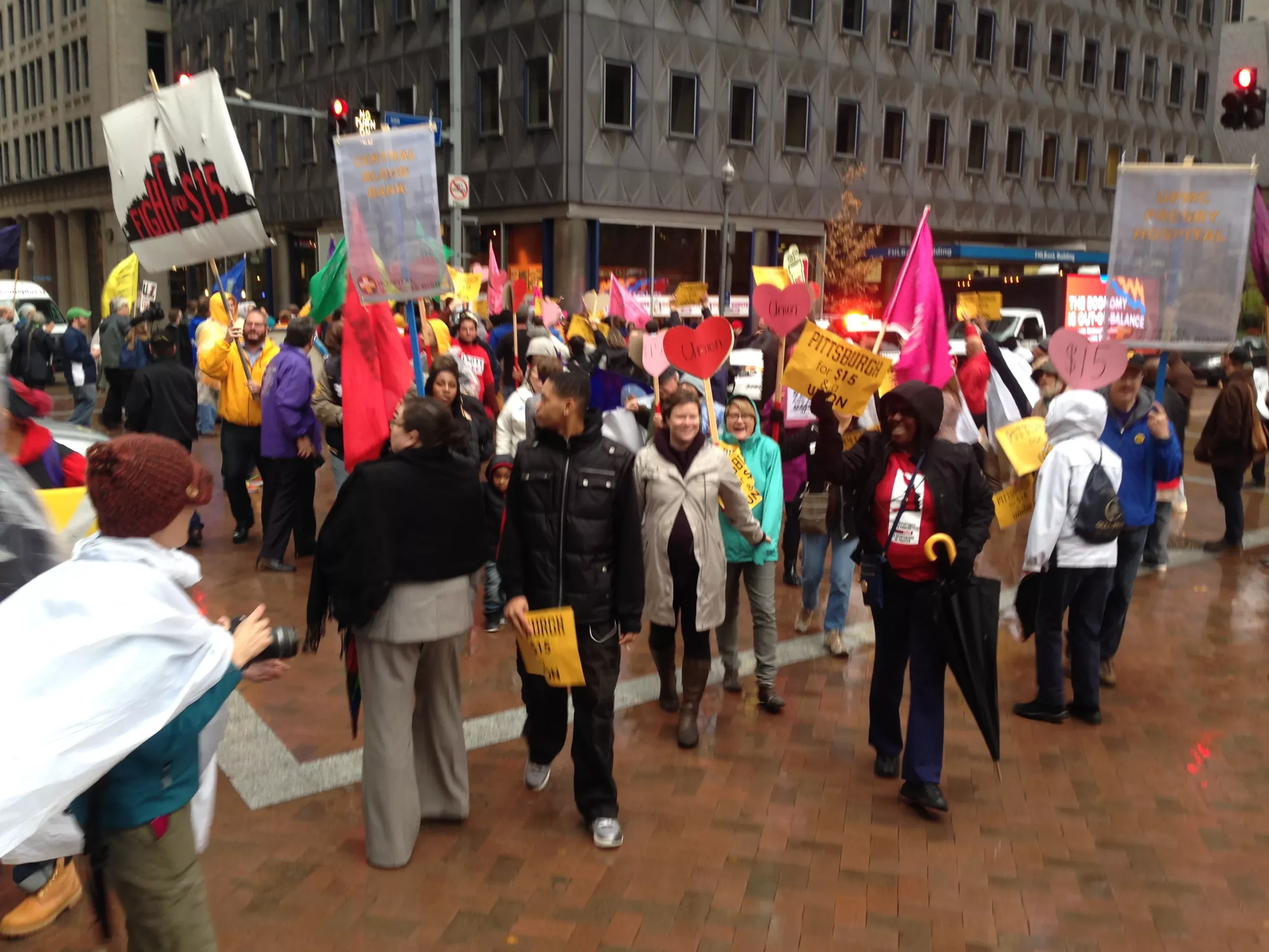 Later in the afternoon, more than 300 supporters joined the fast-food workers and marched through Downtown streets calling for a $15 wage and the right to form a union, an ongoing battle for many service workers. The protests were held on a cold and soggy November afternoon as a reminder that one year from now, Americans will head to their polling places for the 2016 elections.