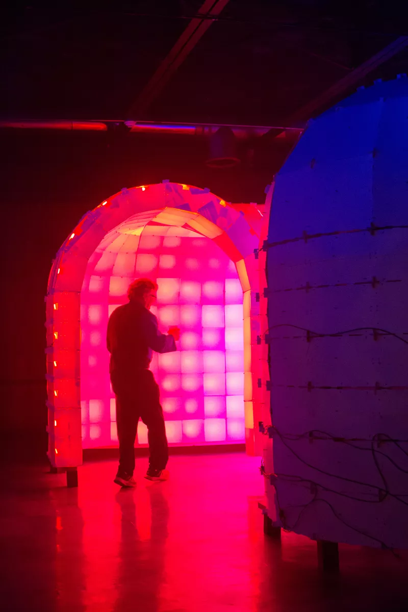 Brill’s Maze is a high-ceilinged structure made of back-lit white plastic panels that glow in a constantly shifting array of patterns and colors. In some respects, it’s an expanded version of Plume, an igloo-like installation he exhibited last year at Pittsburgh Center for the Arts. (And Brill’s been doing related work for years.)