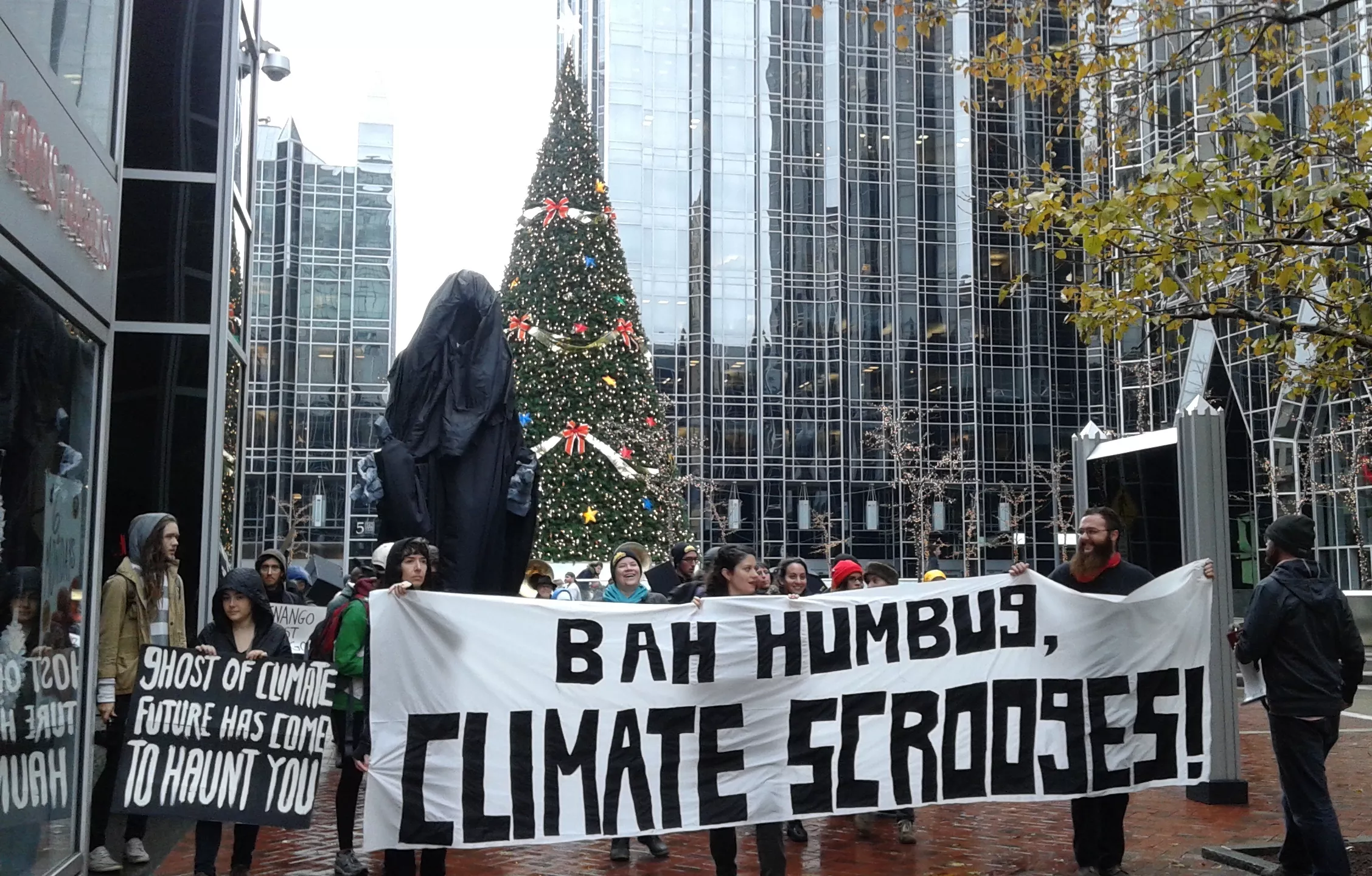 On Tuesday, the “Ghost of Climate Future” could be seen marching through downtown Pittsburgh as part of  A Christmas Carol-themed protest against climate change. Organized by Three Rivers Rising Tide, The demonstration called out ties between local corporations and the Allegheny County government, calling them “climate Scrooges.”