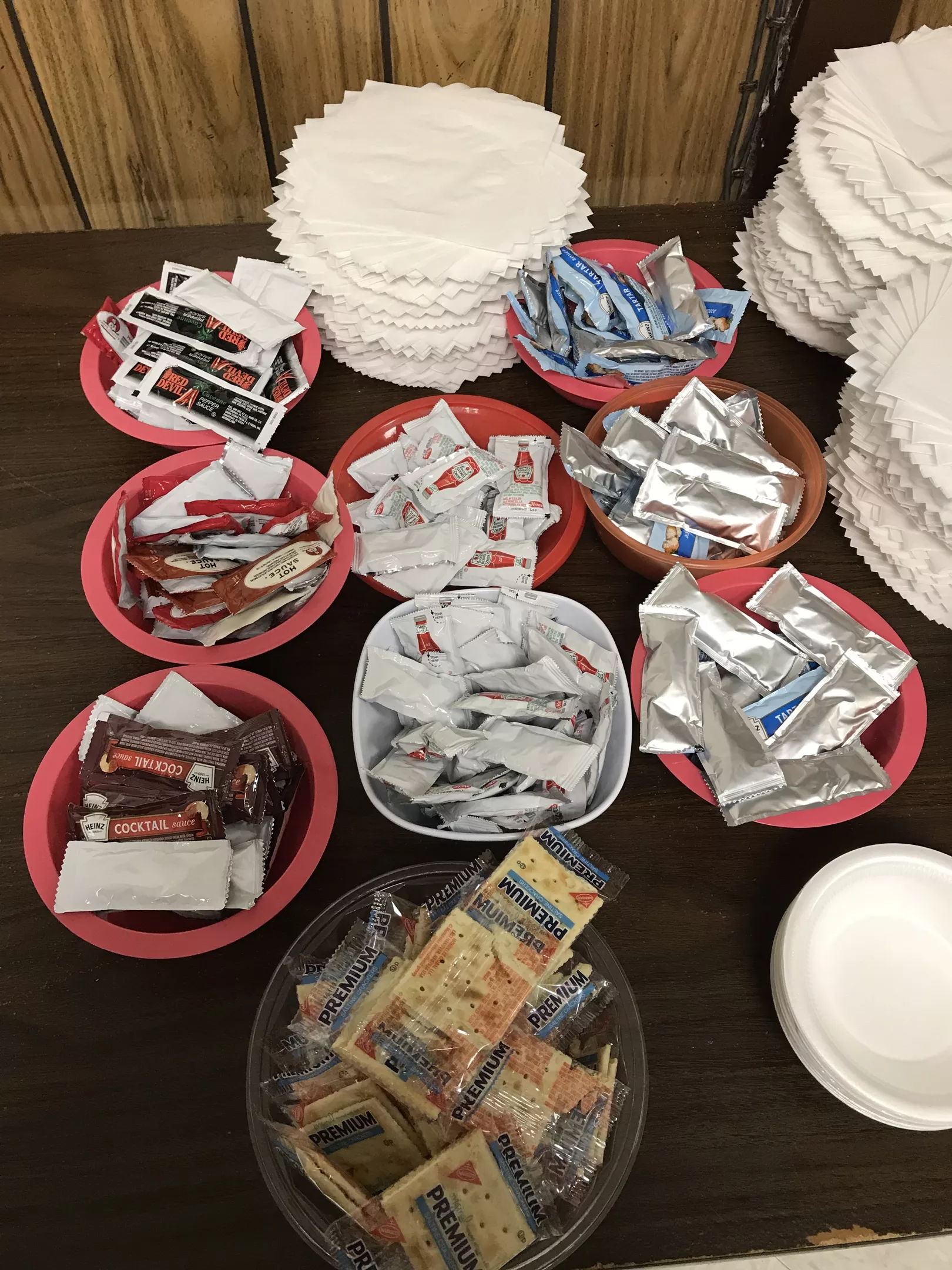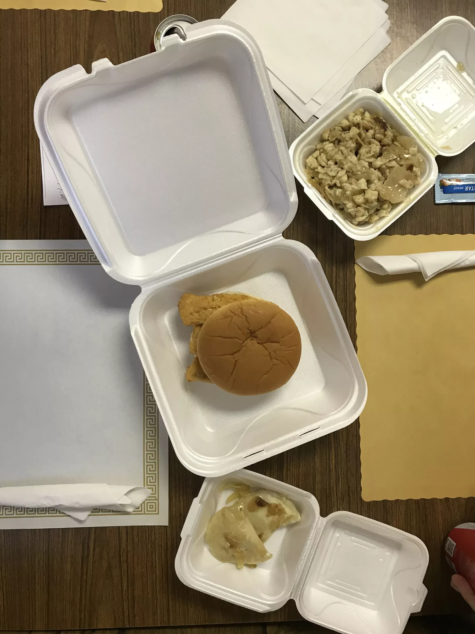The smallest basement hosts a few fully set folding tables adorned with small flower vases. The menus include a dinner (a fish sandwich with French fries and coleslaw), a fried-fish sandwich, mac-and-cheese, pierogi, haluski and a shrimp chowder. A friend and I got a sandwich to split with an order of two pierogi and haluski.