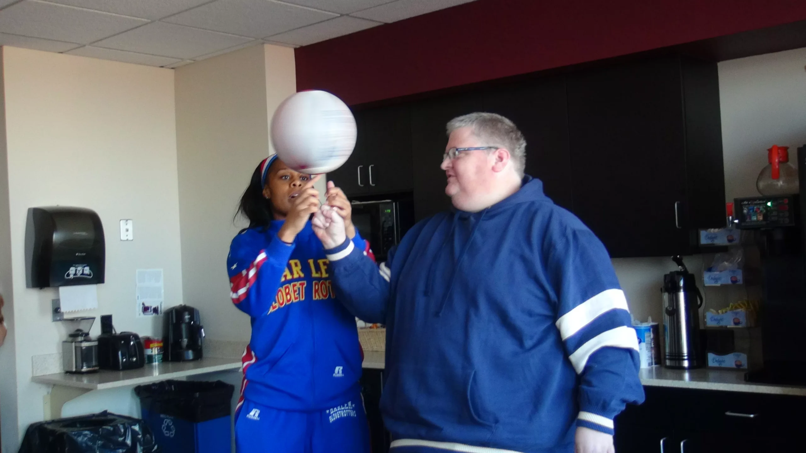 For me, I could probably go about 12-13 seconds, but I have teammates who can go like 16 seconds. We have a guy named Slick who can spin two balls at the same time, do tricks with two balls at the same time. I’ve got a teammate who just broke the world record for spinning it on his nose, which is amazing. These are veteran guys who are about 10-14 years in. I come in, I’m going into my third season, and I’m kind of impatient, and I’m like, “I need to get that right now!” But they say, “Look, it took us some time to get that too.”