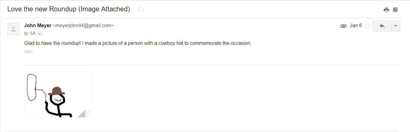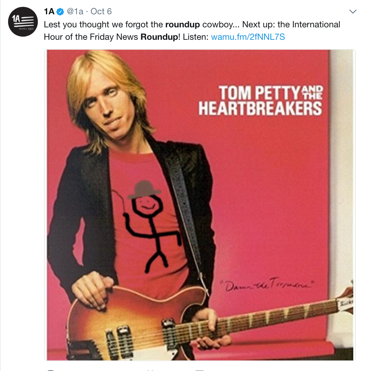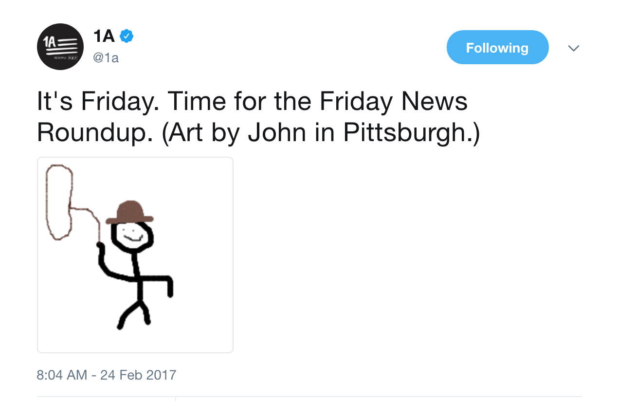 Last week, I was discussing the NPR/WAMU show 1A with CP intern Hannah Lynn, and she mentioned that her friend John drew the lasso stick figure. I’m a big fan of the show, but I can’t say I pay a whole lot of attention to its Twitter, so I didn’t know what she meant. Basically, every Friday there’s a weekly news roundup (a holdover from the program it replaced, The Diane Rehm Show); every tweet related to the roundup incorporates a small stick figure wearing a brown hat, holding a lasso, smiling (sort of).