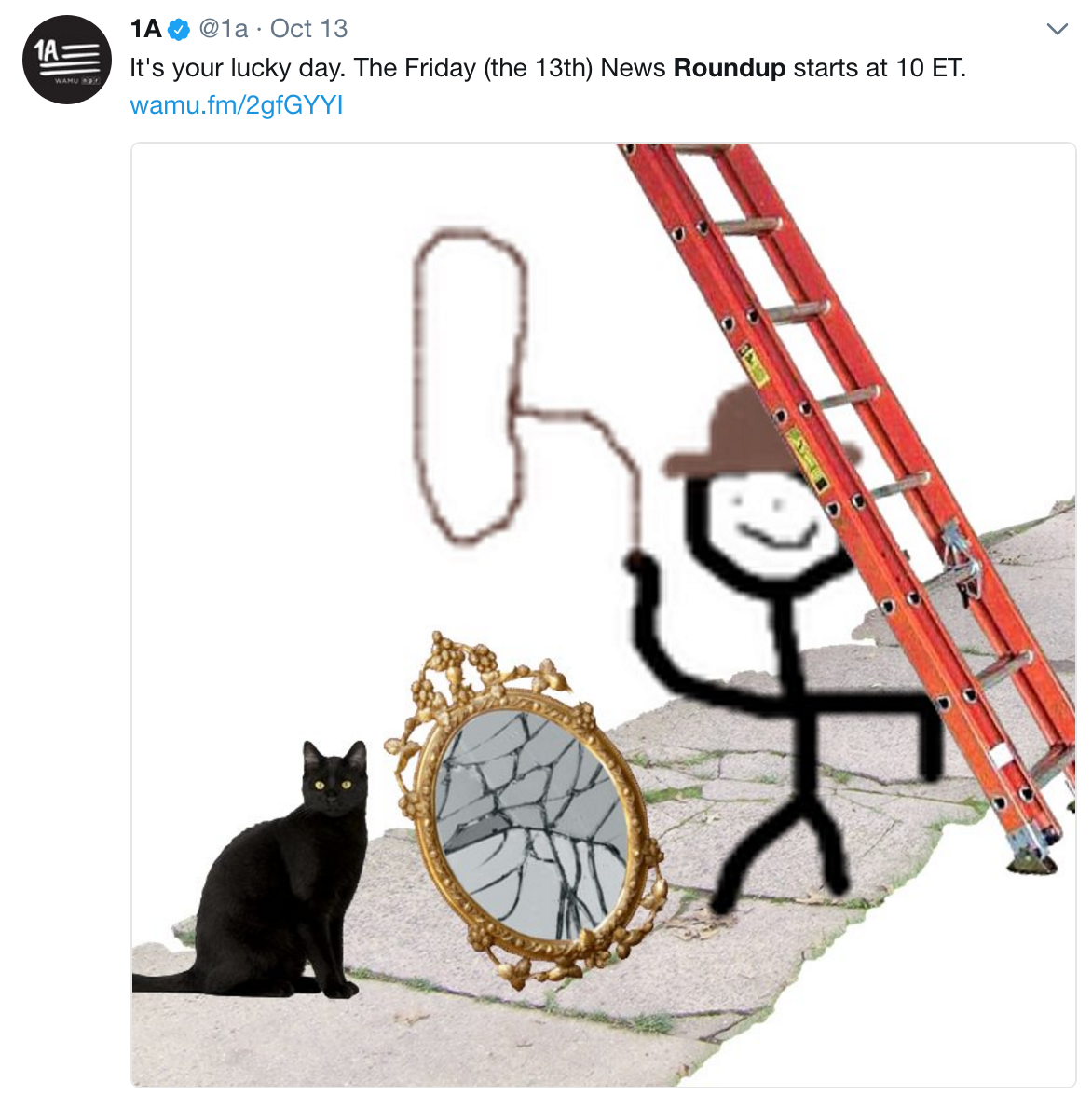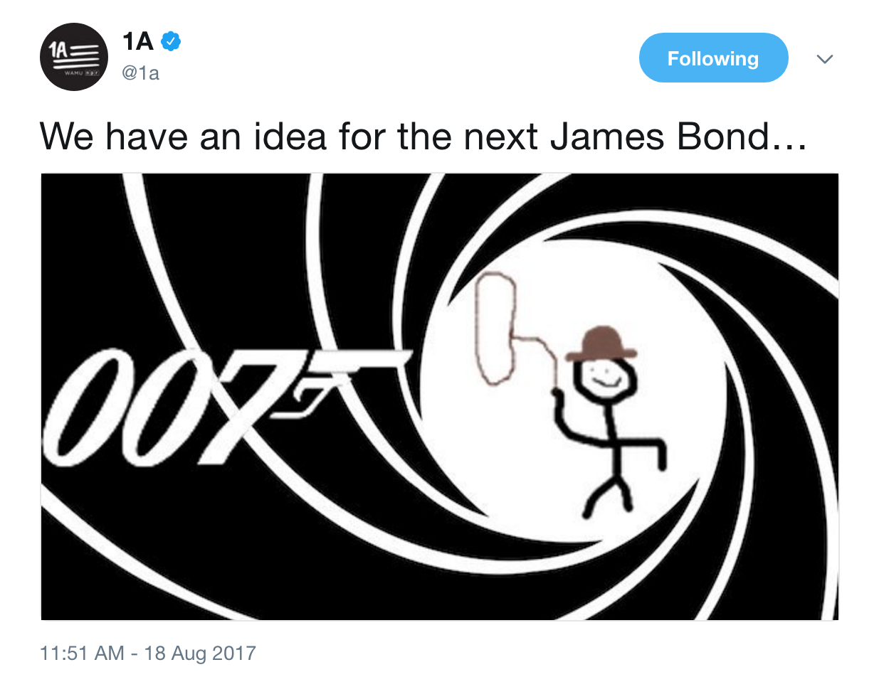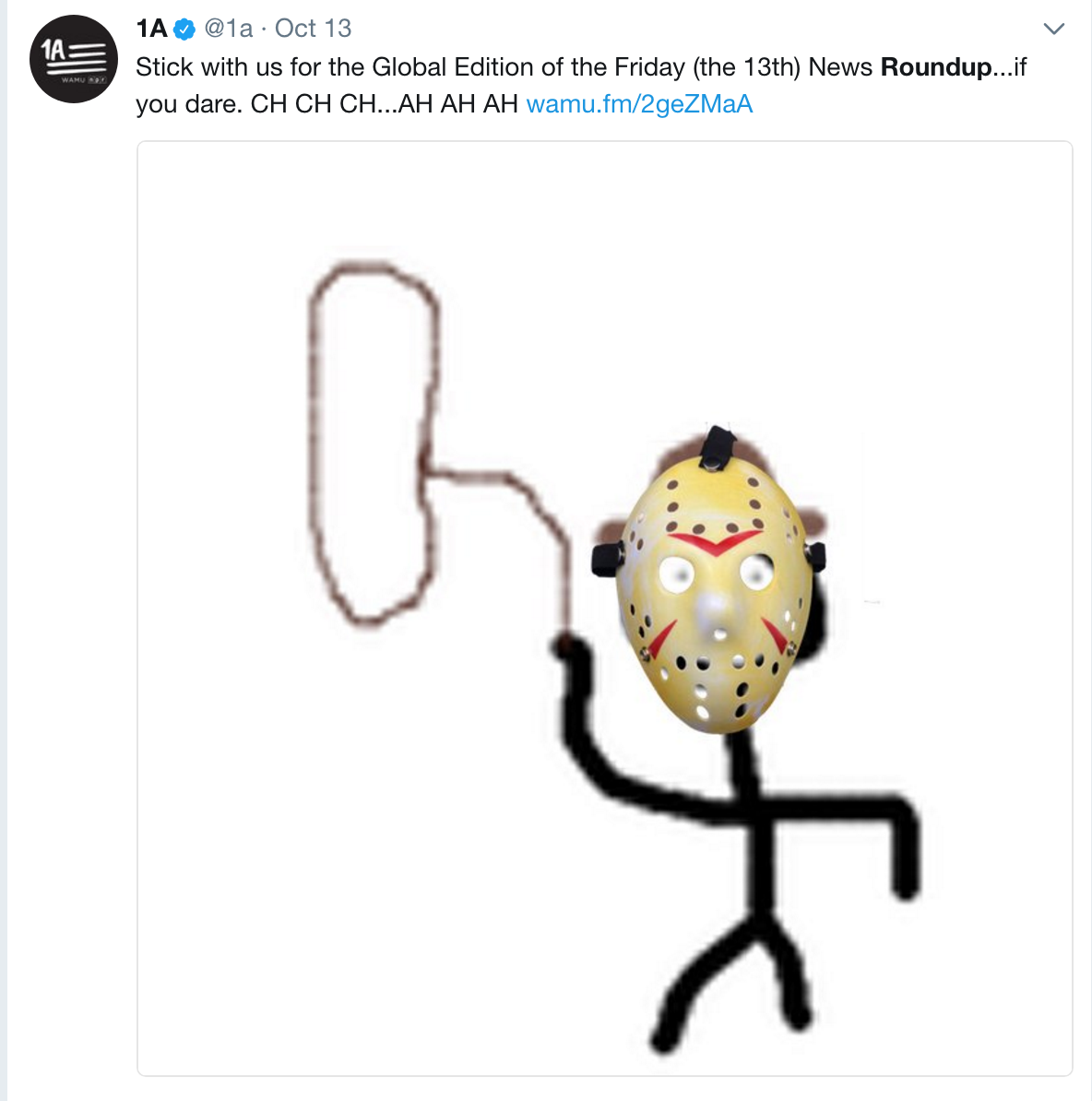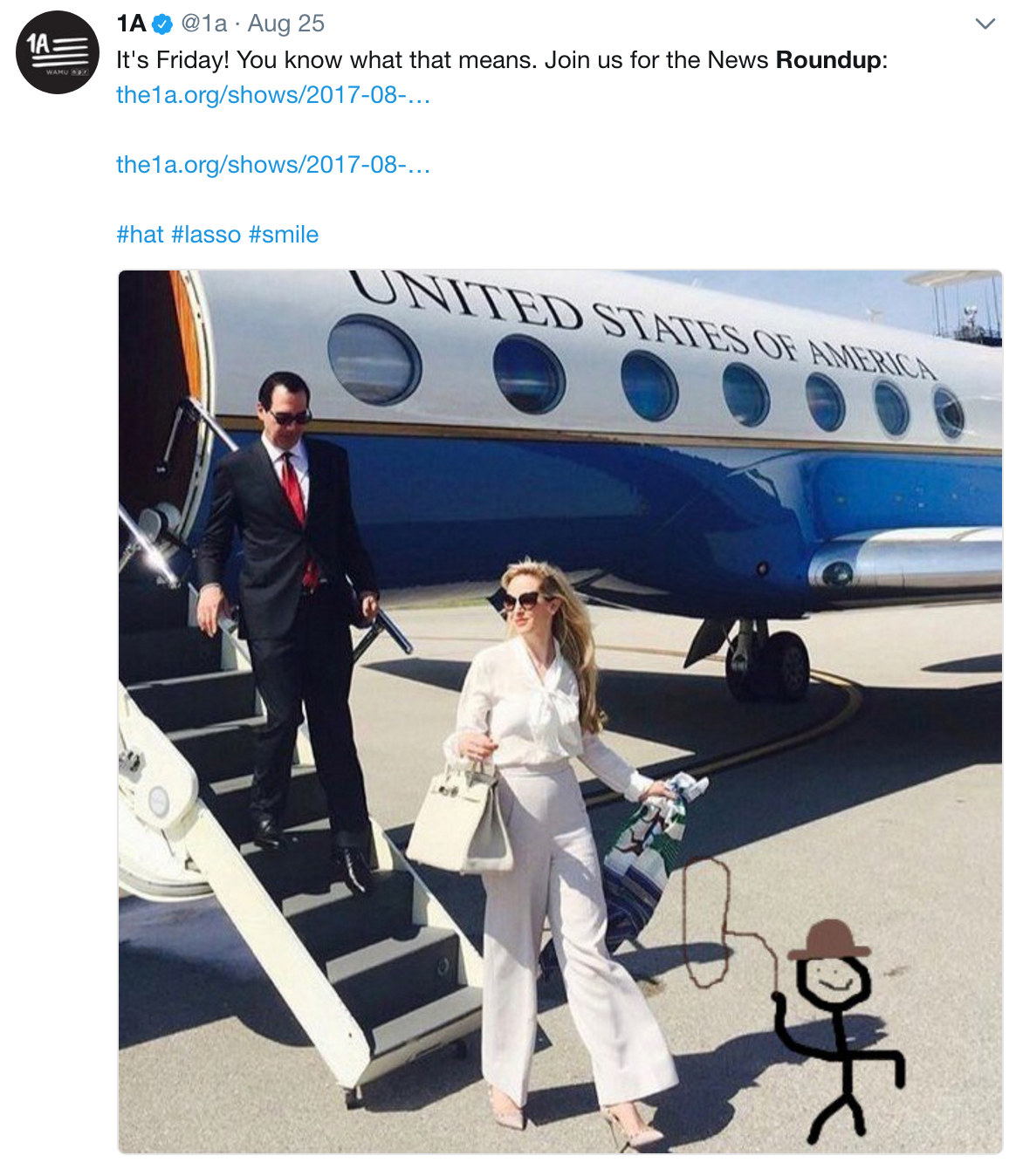 Part of the appeal for me is that 1A is a fairly serious news program and stick figures are notoriously unserious. These crudely assembled meme-ish images feel so at odds with the rest of the branding (check out the logo) but it somehow feels right. Maybe that’s the point. Maybe Friday mornings are a good time to take a deep breath after a week of troubling news, and smile at the little cowboy casting its sights on a deplaning Louise Linton.