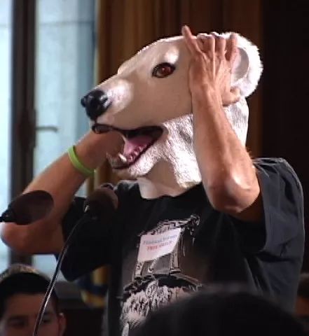 What’s going on here? Isn’t it obvious? It’s a polar bear testifying before City Council. About goddamn time too, if you ask me.