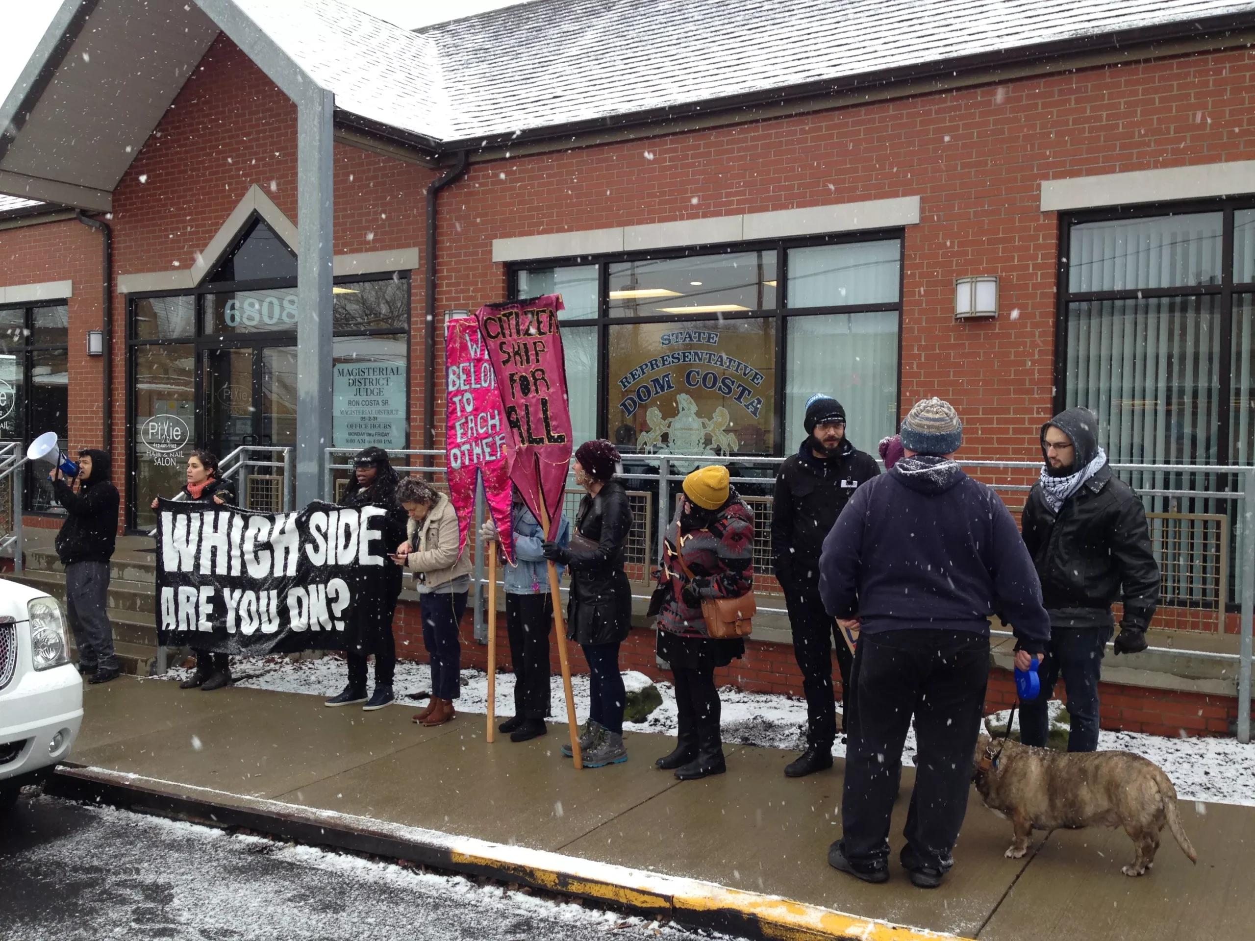 A group of 25 protested outside Costa’s office in Morningside on the morning of Feb. 2. Some were with immigrant-rights groups, others were just Costa constituents who disagree with his voting record on immigrants.