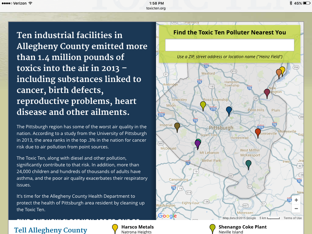The organization rolled out the website in conjunction with the release of its “Toxic Ten” report written with the policy organization Frontier Group and funded by the Heinz Endowments and the Colcom Foundation.