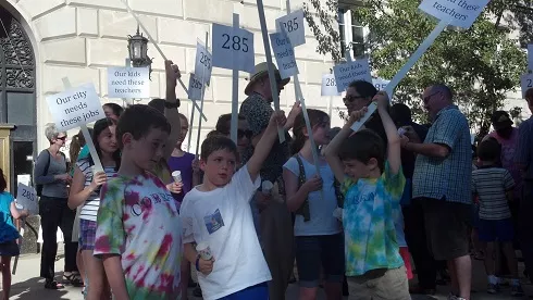 Holding signs that said “285,” “Our kids need teachers,” and “Our city needs these jobs,” several dozen educators, parents and children gathered in front of the Pittsburgh Board of Education Wednesday afternoon to protest education cuts and attract media attention for the 285 teachers furloughed by the Pittsburgh School District in May.