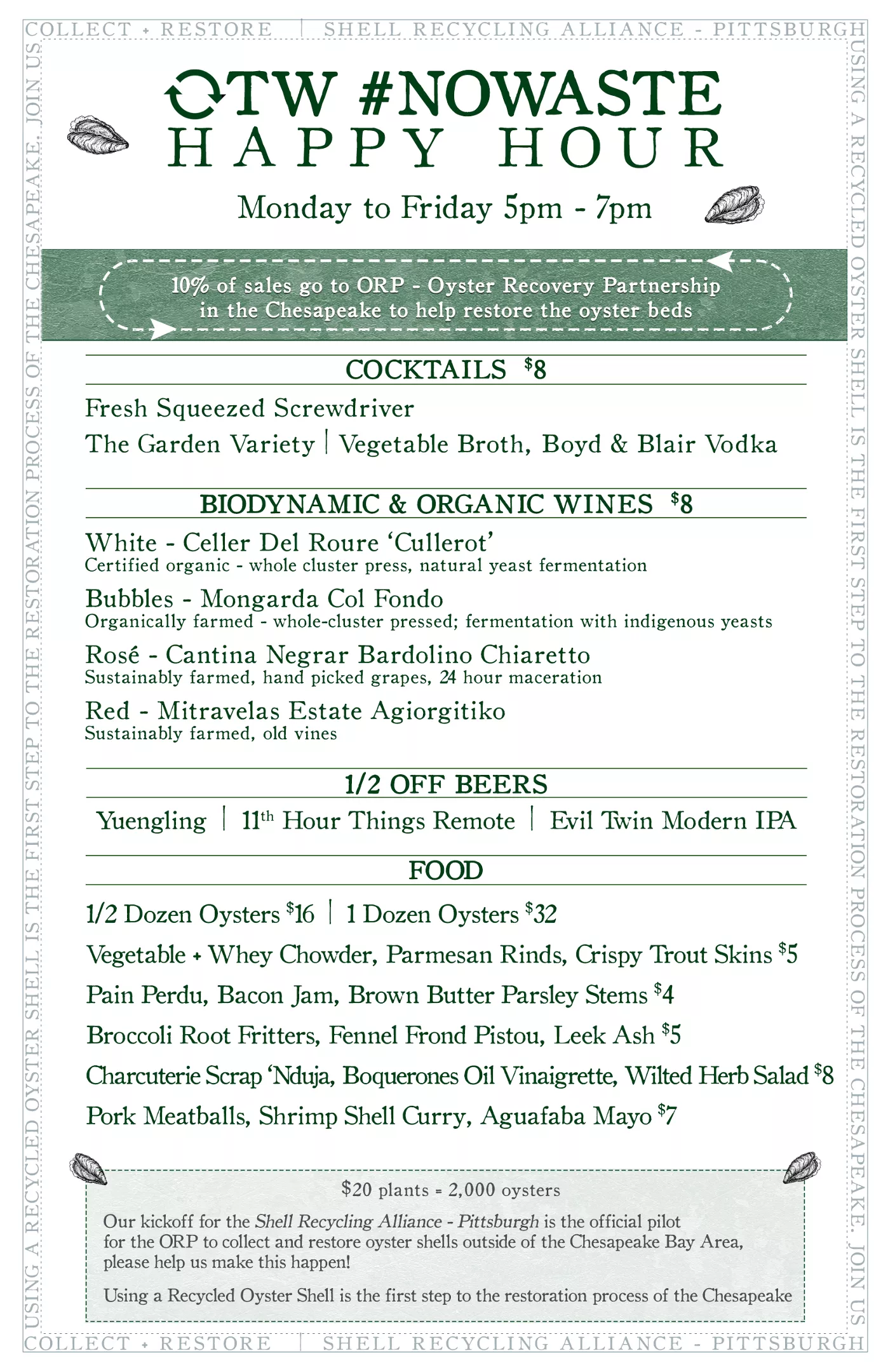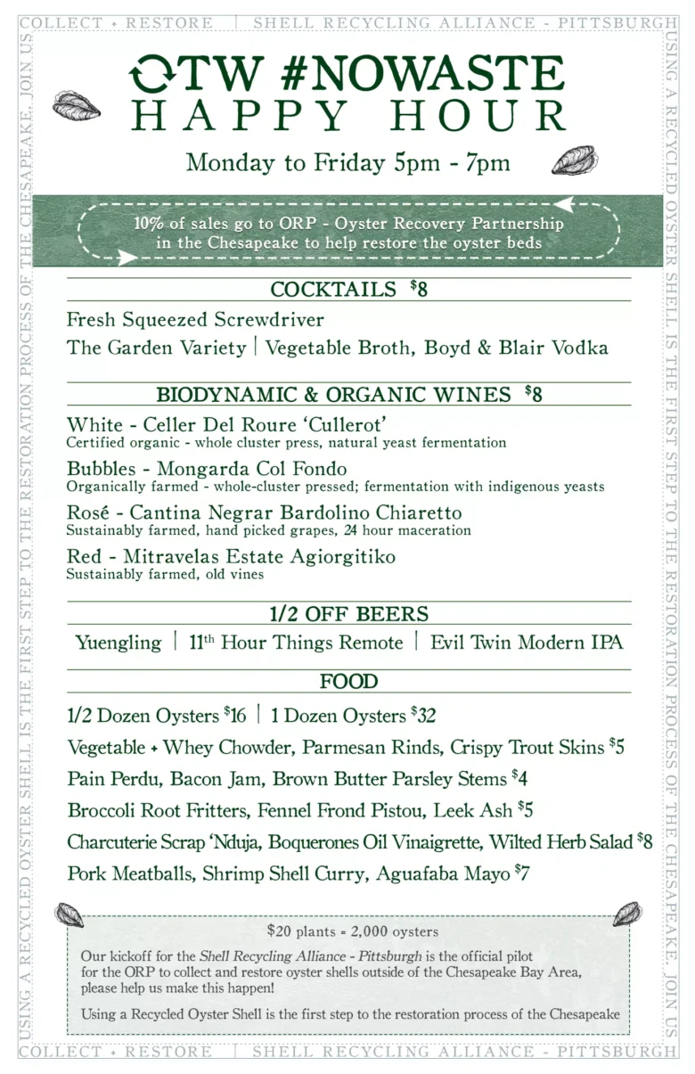 Ten percent of the sales will go to the Oyster Recovery Partnership located in the Chesapeake Bay. ORP helps to restore oyster bed through education, aquaculture, restoration and shell recycling. ORP is using Pittsburgh as its first pilot city for a shell recycling program outside of the Chesapeake Bay Area.