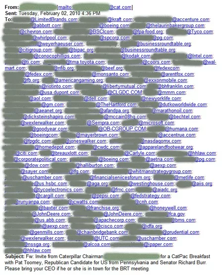It’s no surprise to see Toomey’s campaign coddling corporate America. That’s where the money is and, among other things, Toomey formerly presided over the rampantly conservative Club for Growth. But the list of e-mail recipients deserves a closer look.