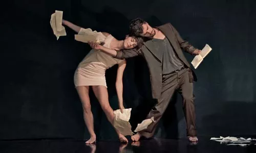 Another breathtaking gambit finds the dancers interacting with animations projected on movable walls behind them. Knight sits at a desk composed of thick, hand-drawn lines that seem quiveringly alive. (It’s actually a real chair and desk, outlines by the animation.) Luebbert stands against a wall, looking like he’s part of a piece of scribbled-on paper — until the paper (complete with sound effects) is crumpled by an unseen giant hand, as Luebbert folds up with it, only to uncrumple and repeat. And so on.