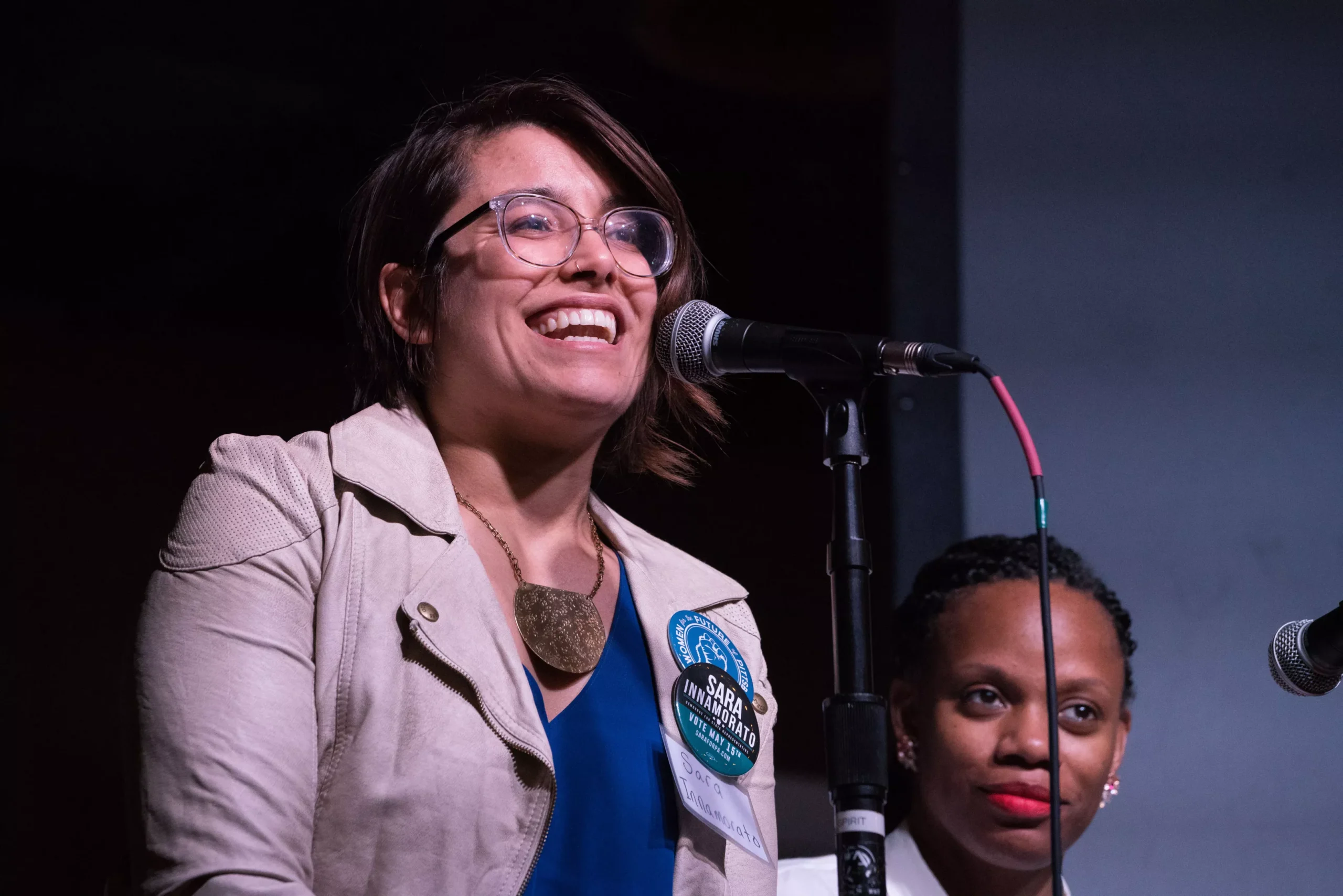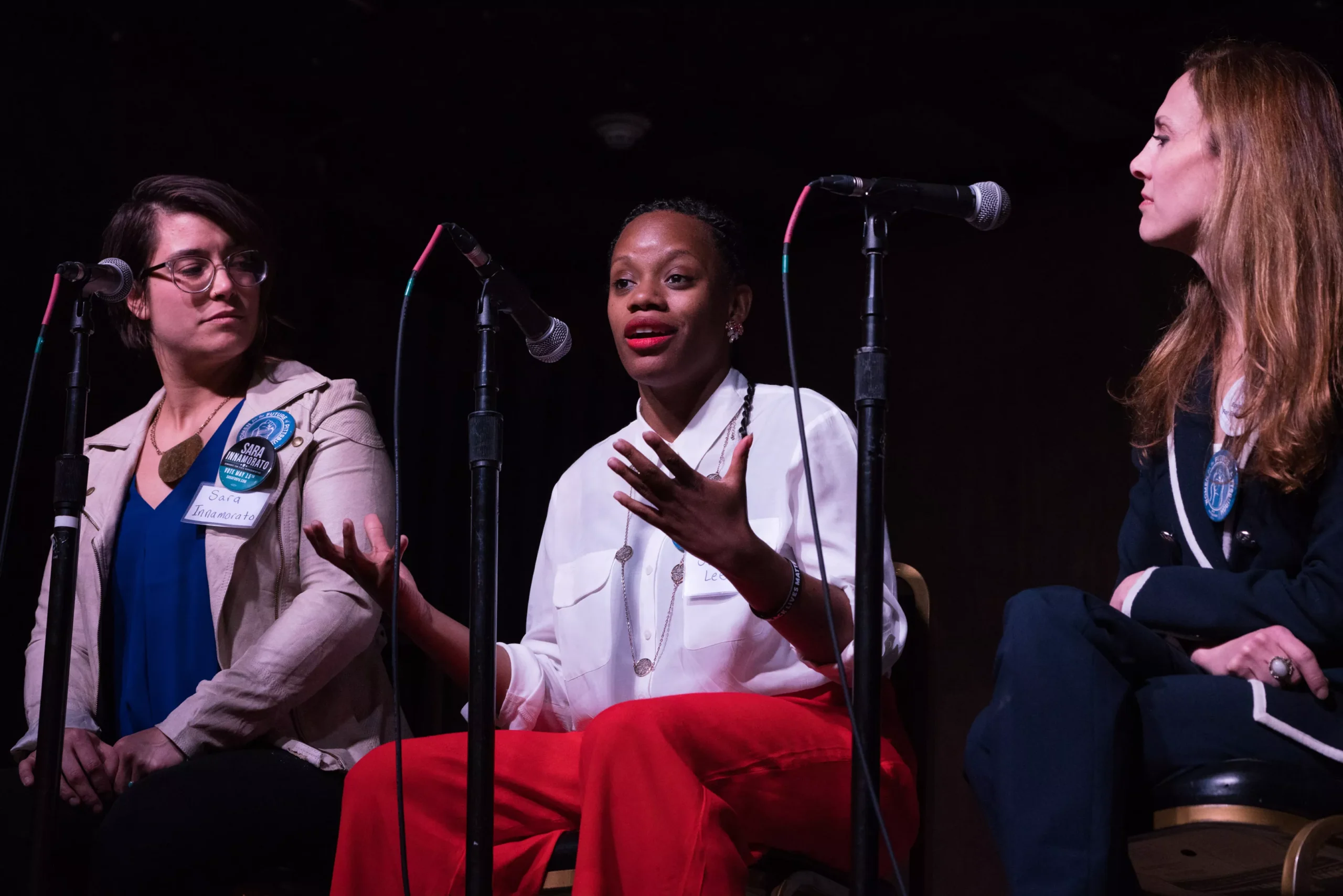 Three Democratic state Rep. candidates took the stage next. Sara Innamorato, who founded a nonprofit to help women run for office, shared the stage with community organizer Summer Lee and nonprofit founder and former television writer Emily Skopov.