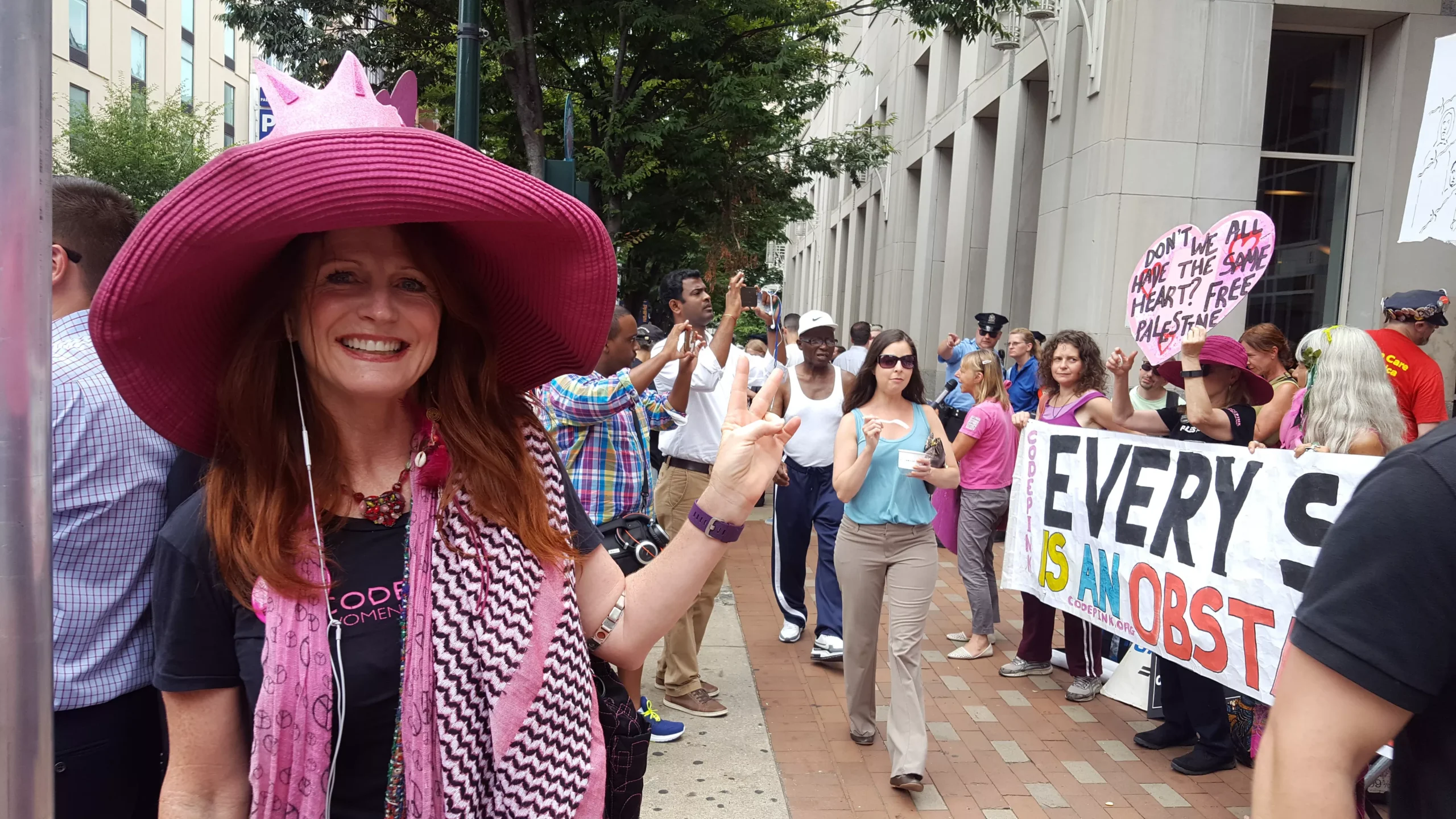 “In Cleveland people felt like they had the right physically touch me,” she told Pittsburgh City Paper today at a Code Pink rally outside of the Pennsylvania Convention Center. “They were really rough. They tried to strangle me with my scarf.”