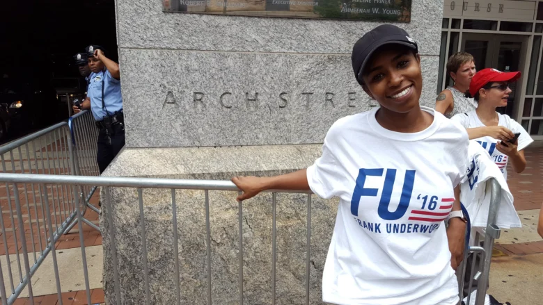 Earlier today, Philadelphia-native Einass Mustafa was handing out t-shirts with the “FU ’16” slogan outside of the DNC as part of a marketing campaign for the show.